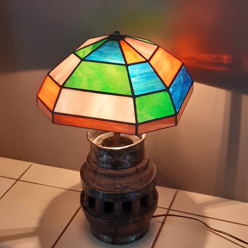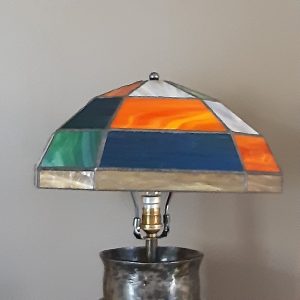 Cette réalisation “2X4”, en vitrail méthode Tiffany, trouve sa place en chapeau de lampe ou de lustre.