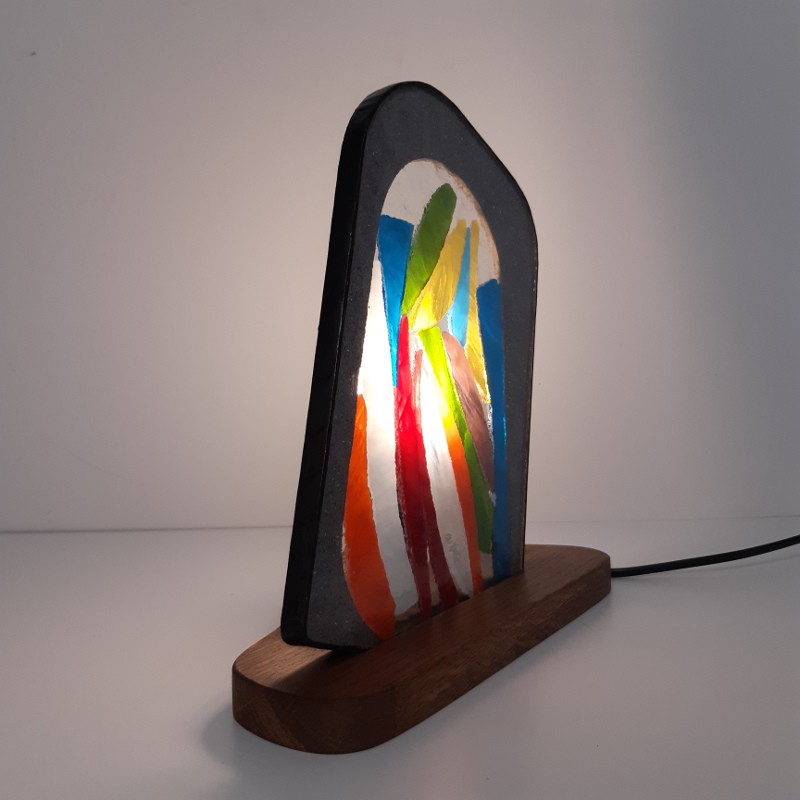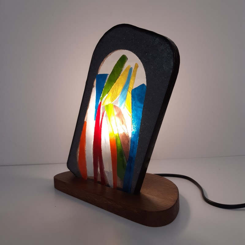 Lampe en vitrail réalisée suivant la méthode à verres flottants.
