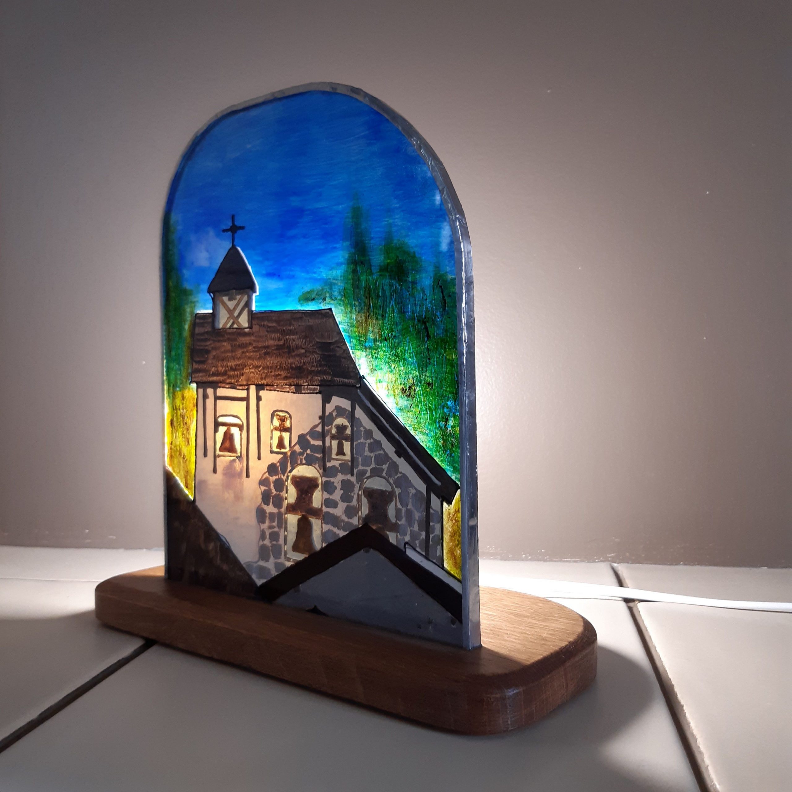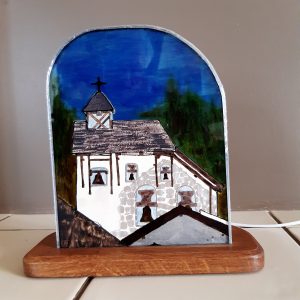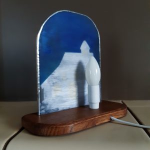 Inspirée d’une photo prise dans le Queyras, cette lampe d’ambiance est réalisée suivant un ensemble de techniques liées au Vitrail : peintures sur verre et dessin, assemblage méthode Tiffany et socle chêne.