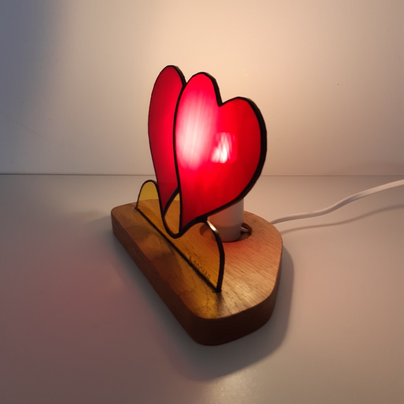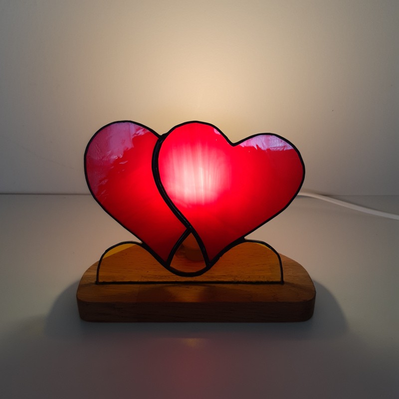Lampe cœurs côte à côte, réalisée en vitrail “méthode Tiffany”, sur socle en bois.