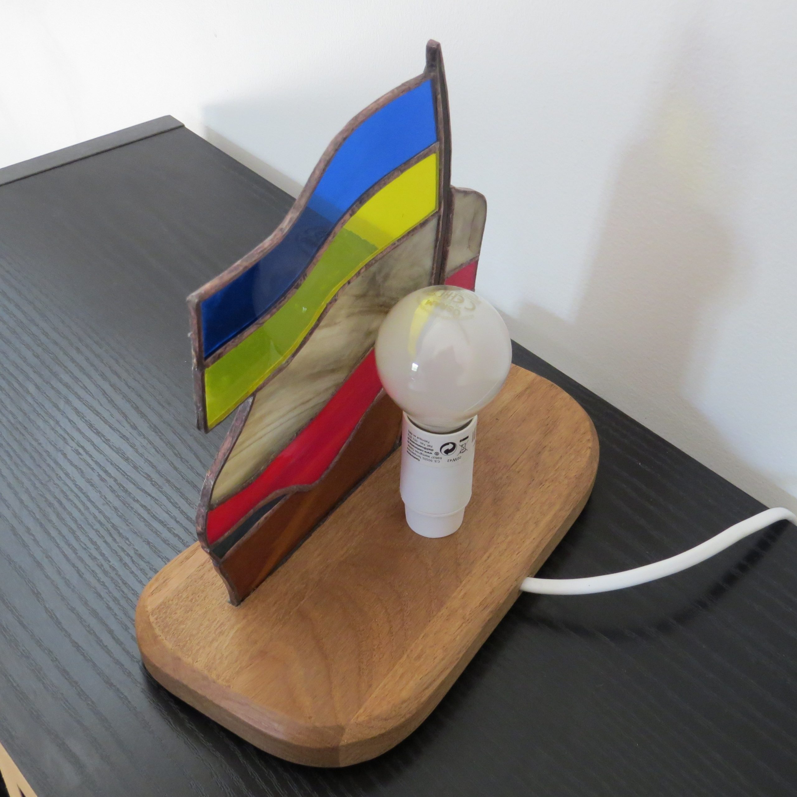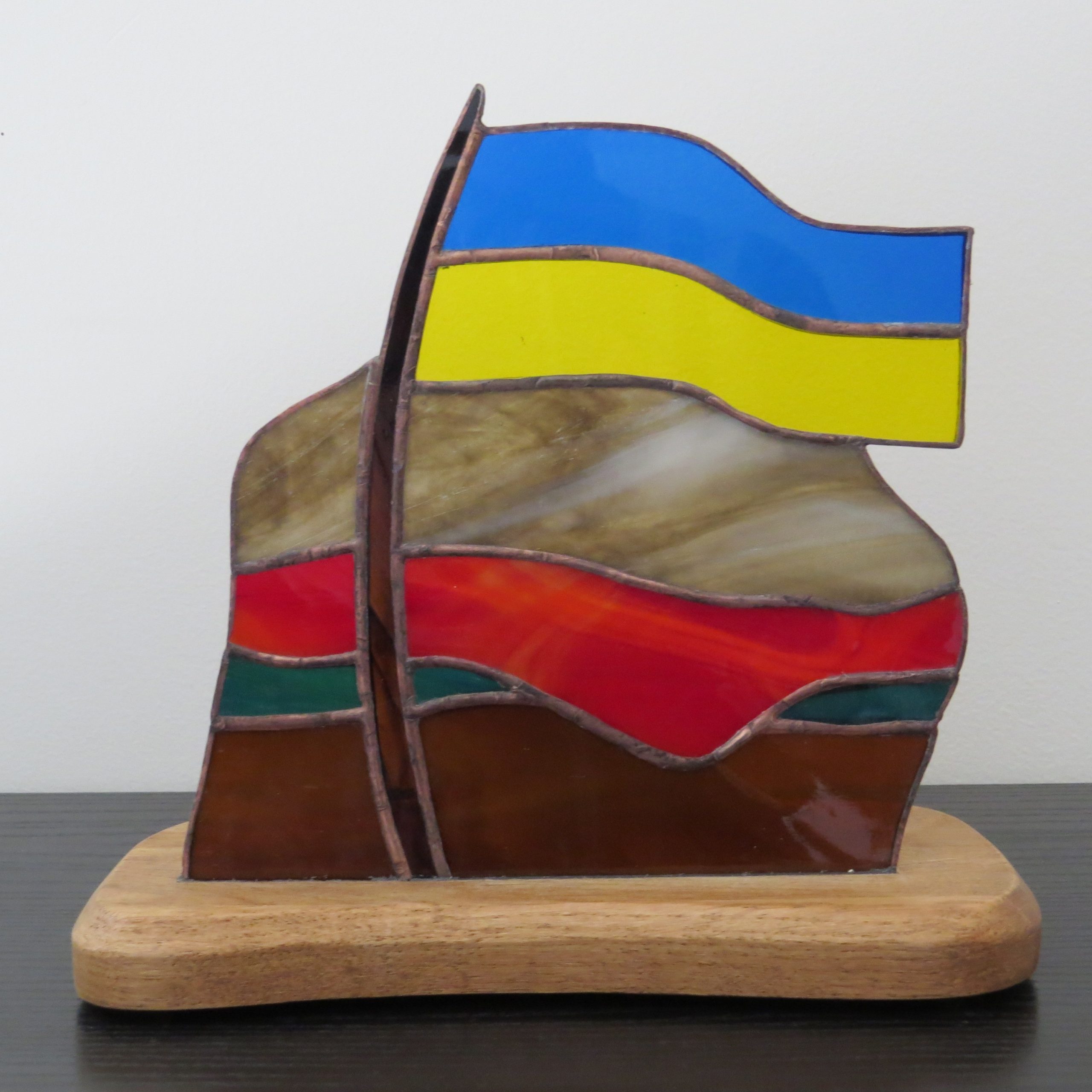 Cette lampe, en vitrail méthode Tiffany, représente les souffrances endurées par l’Ukraine.