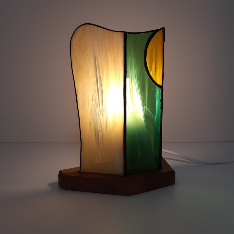 Cette lampe est réalisée en vitrail méthode Tiffany, sur socle en chêne, travaillé à la main, ciré et munie de plots anti-glissement.