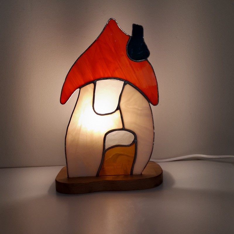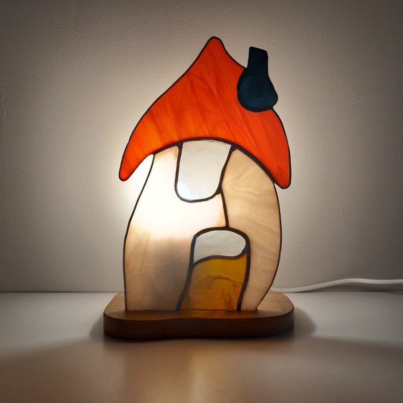 Maisonnette est en vitrail “méthode Tiffany” insérée dans un socle en bois, travaillé à la main, ciré et muni de plots anti-glissement.