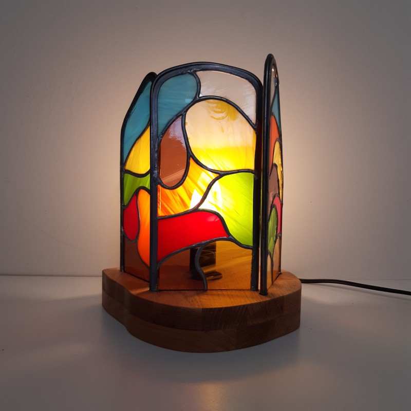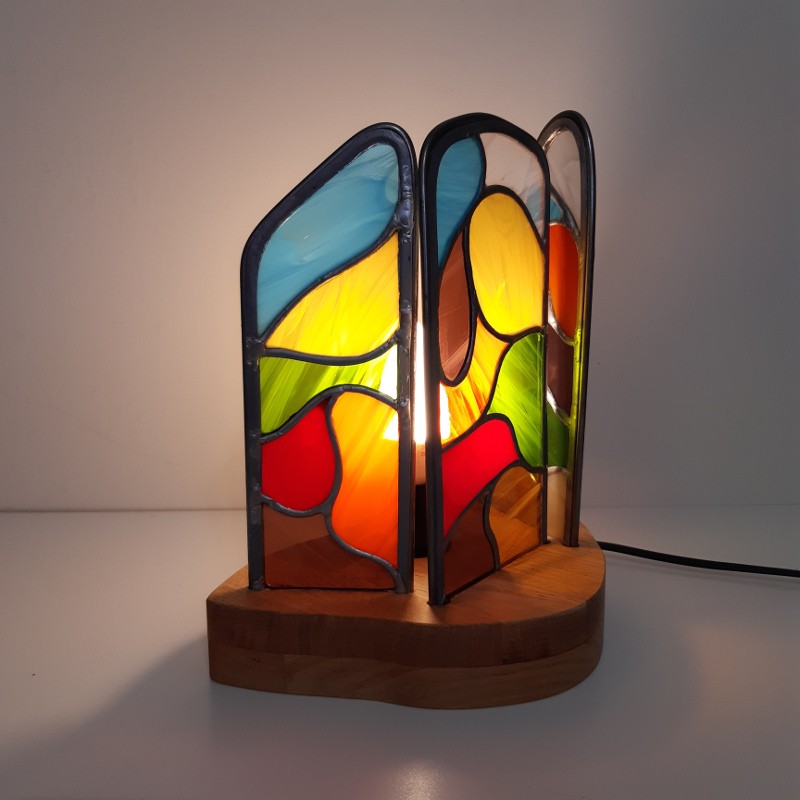 Cette lampe “TRIADE” est idéale en lampe de chevet originale, avec ses 3 faces indépendantes. Chaque facette est ceinturée d’un profil plomb renforcé par un profil acier. Les ensembles sont insérés dans un socle bois travaillé à la main, ciré et muni de plots anti-glissement. C’est une création unique, numérotée, livrée avec son certificat d’authenticité.