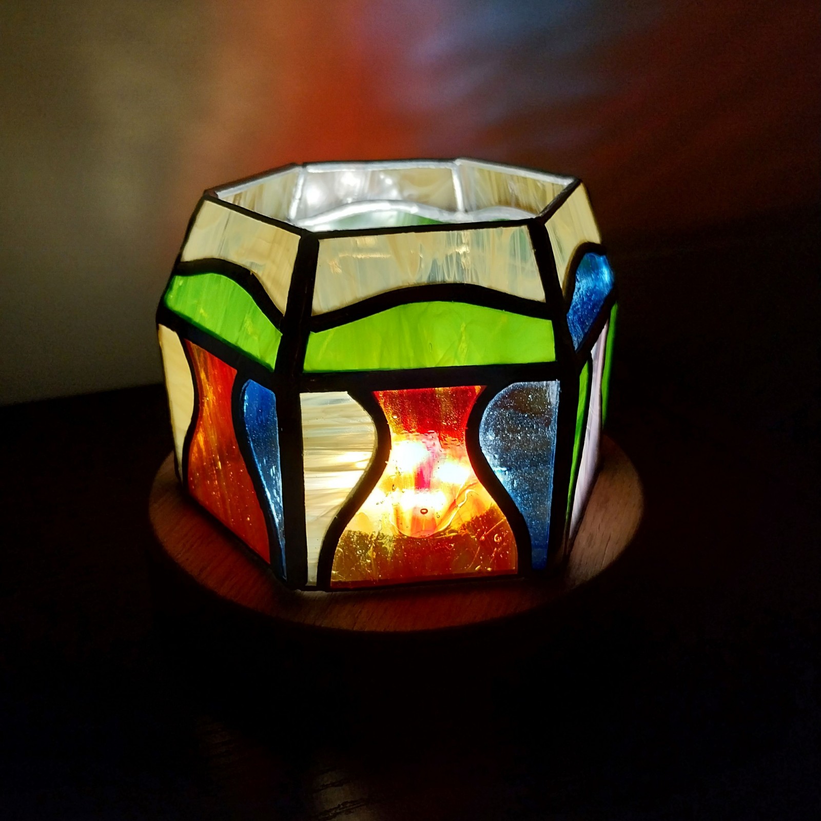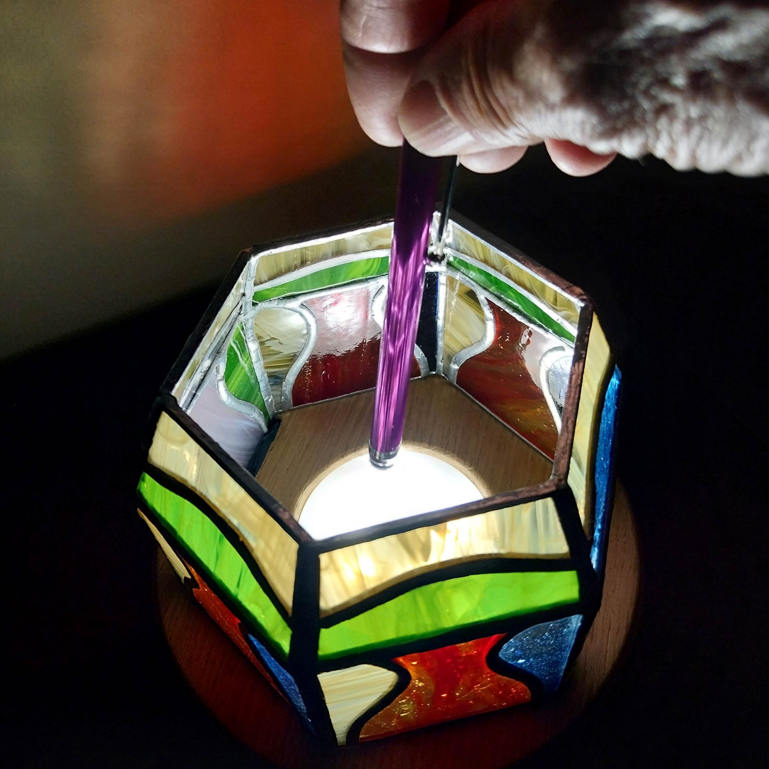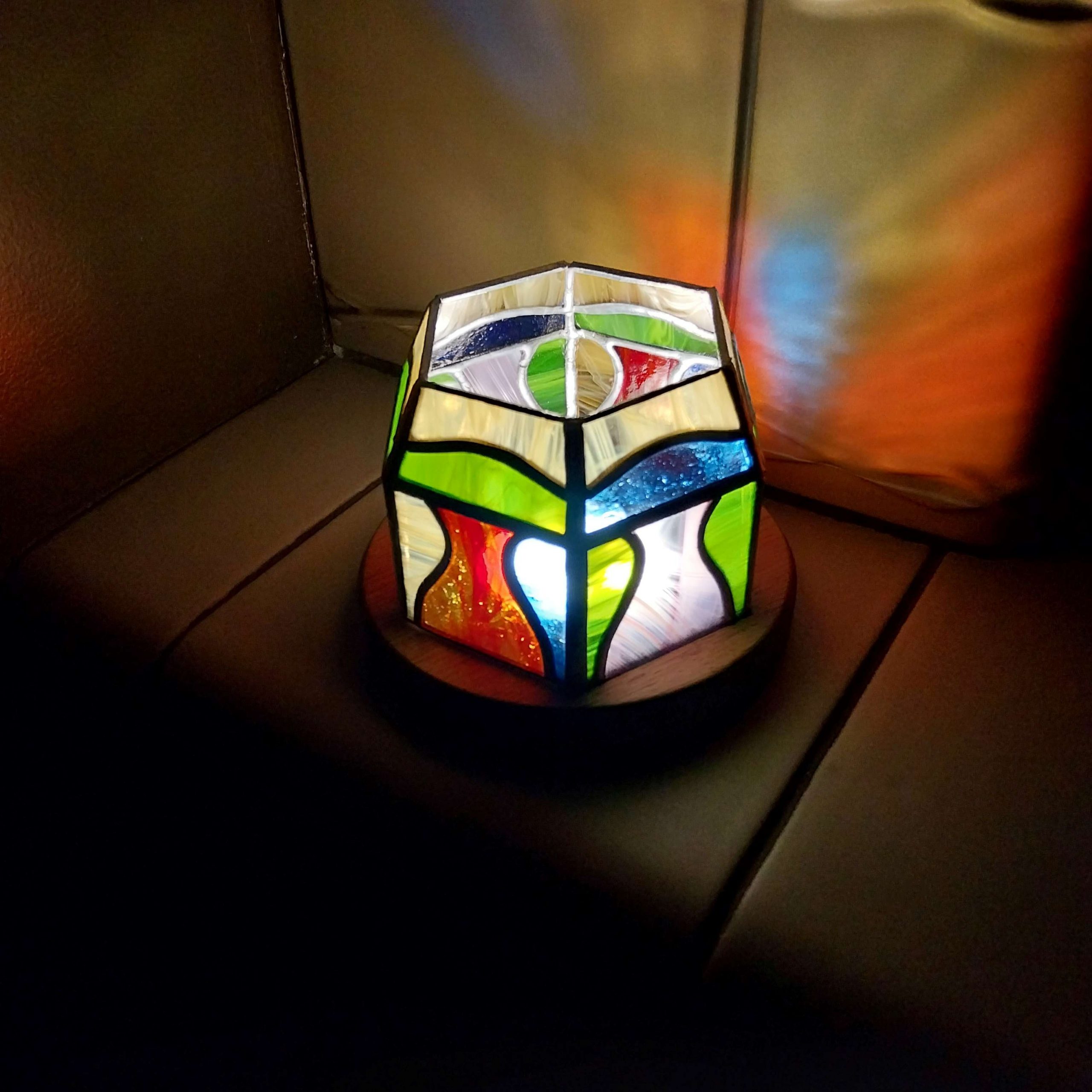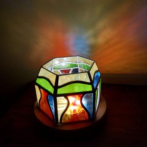 Réalisée en vitrail méthode Tiffany avec 6 facettes, cette lampe photophore “CONFIDENCE” est idéale pour votre soirée coccooning.