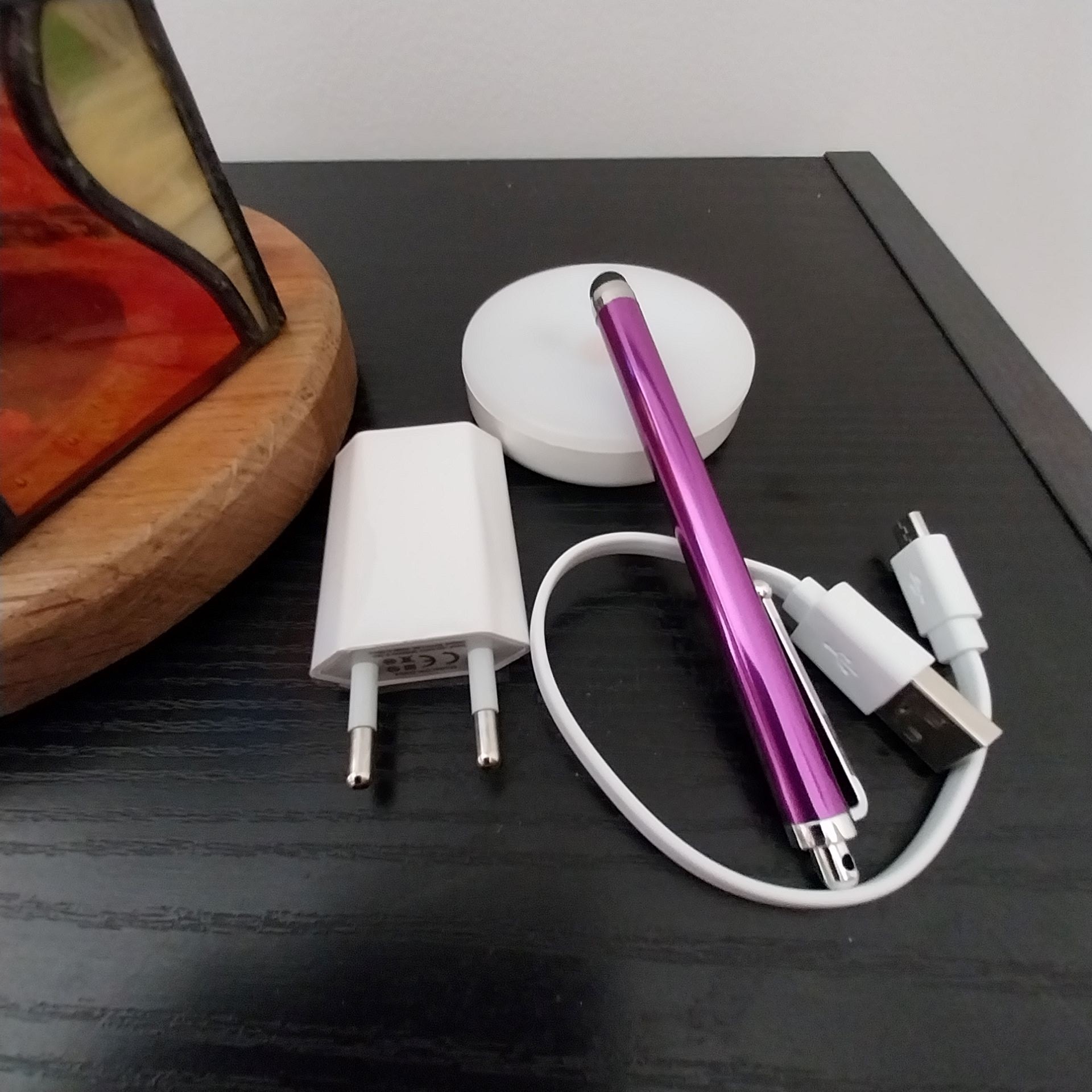 Cordon USB, chargeur et stylet de commande accompagnent la fiche technique.