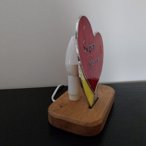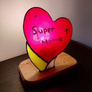 Cette lampe, en vitrail Tiffany, “SUPER MAMIE”, évoque l’admiration portée à nos ainées.