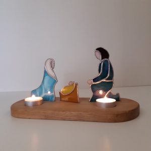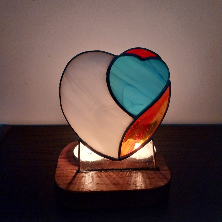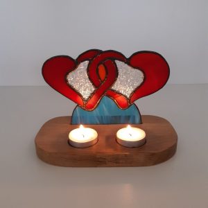 Photophore vitrail Tiffany en forme de coeur sur un socle en chêne.