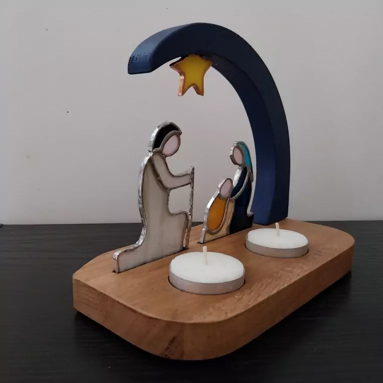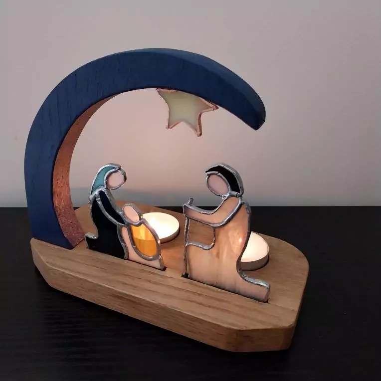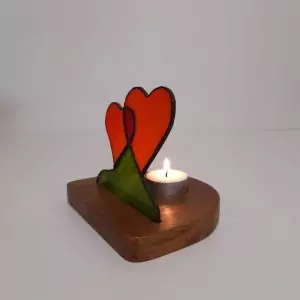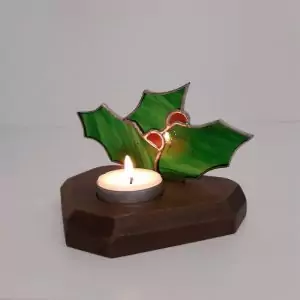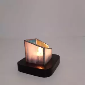 Ce photophore réalisé en vitrail Tiffany, sur socle chêne travaillé à la main.