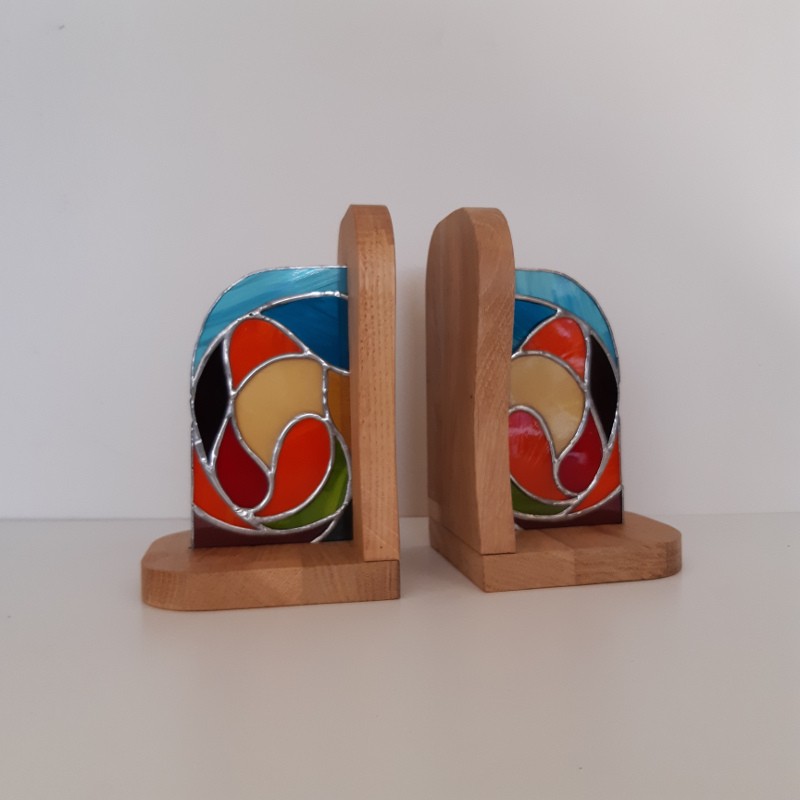 Ces Serre-livres “ARABESQUES” sont en vitrail méthode Tiffany et bois.
