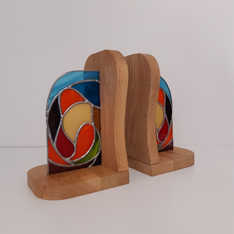 Pour encadrer vos lectures,2 serre-livres symétriques, réalisés en vitrail méthode “Tiffany”, insérés dans des équerres en chêne ciré, munies de plots anti-glissement.
