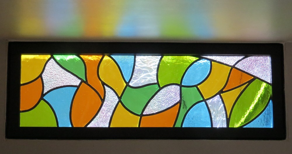 Tel un soupirail, ce panneau en vitrail traditionnel au plomb diffuse ses couleurs et la lumière entre deux pièces.